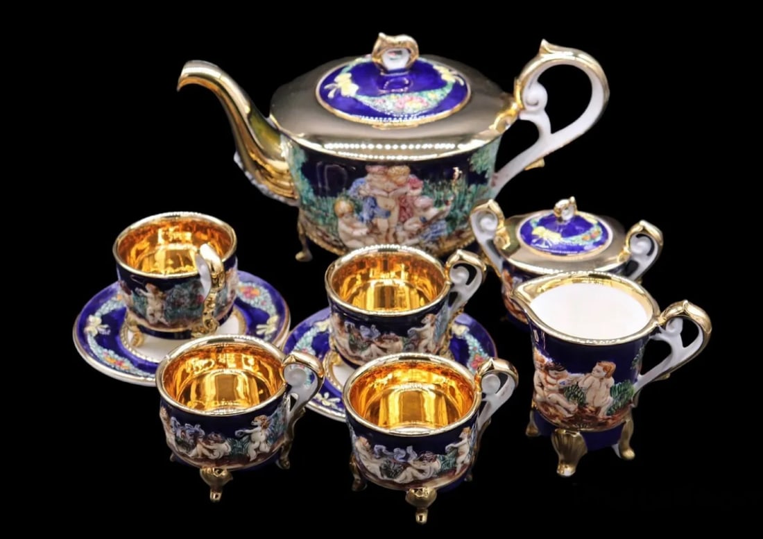 Capodimonte Cobalt and Gold Cherub Footed Tea Set