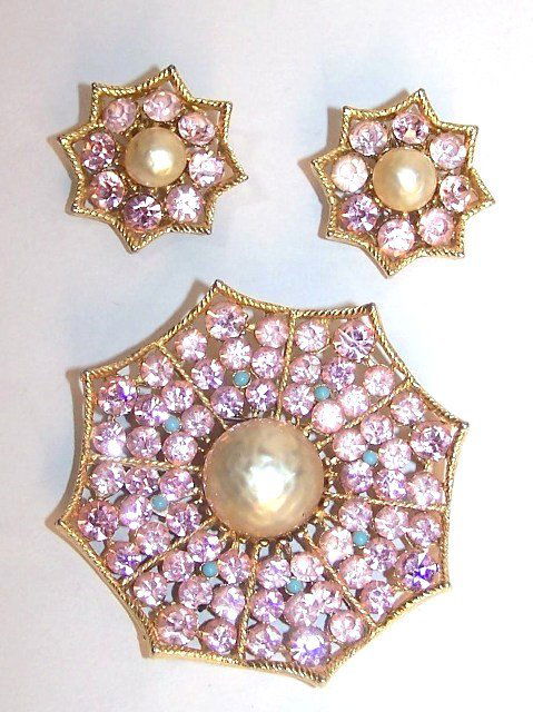 Vintage Pink Glass Rhinestone Gold Tone Brooch Pin Clip Earrings SetGolden Age Jewelry Auctions4.5(57)$64 days Left