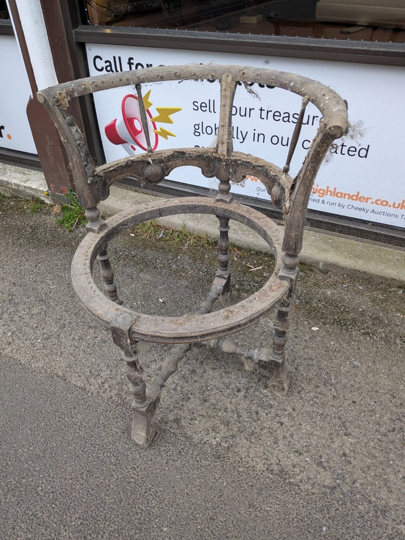 SoldANTIQUE TURNED WOOD CHAIR FRAMEAntique chair frame with wood turnings. Dimensions: H 41.5" x W 27" x D 28" x SH 12" Condition: Frame only, in need of restoration. Some paint wear and marks. Upholstery on arms in need of replacementSee Sold Price