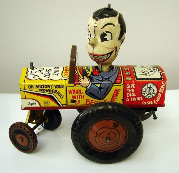 SoldMarx Tin Litho Windup The Milton Berle Car BoxedThis is a tin litho windup Marx Milton Berle Crazy Car with original box. This is a great character toy! Milton Berle's head spins and the car moves erratically when wound up. The litho is bright andSee Sold Price