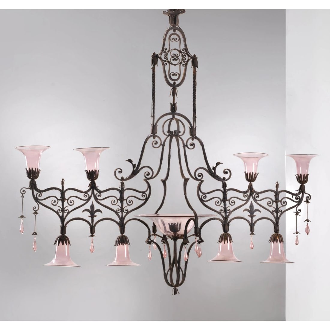 SoldCARLO RIZZARDACandeliere. Ferro battuto, lamiera sbalzata, vetro stampato e acidato. Italia 1900 ca. cm 115x115 Cfr. : AA.VV., Carlo Rizzarda, fabbro maestro, Castaldi Editore, 1967 A CHANDELIER BY C. RIZZARDASee Sold Price
