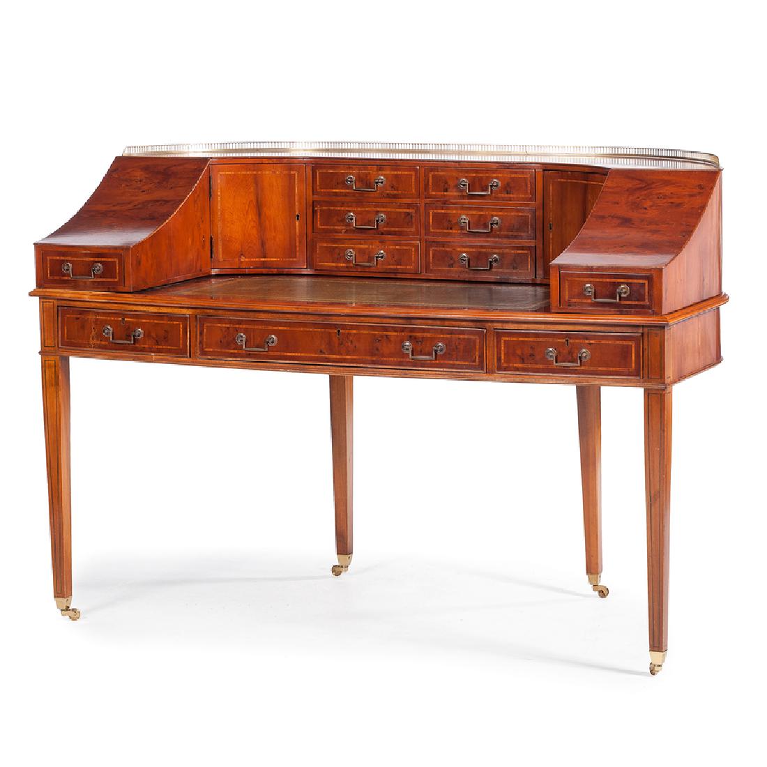 SoldGeorge III Carlton House DeskFine inlaid satinwood and rosewood desk, with a leather inset top, circa 1790. Provenance: Sotheby's April 14, 2016 sale, lot 306. Bought for $27,500. [38 1/2" H x 61" W x 33" D].See Sold Price