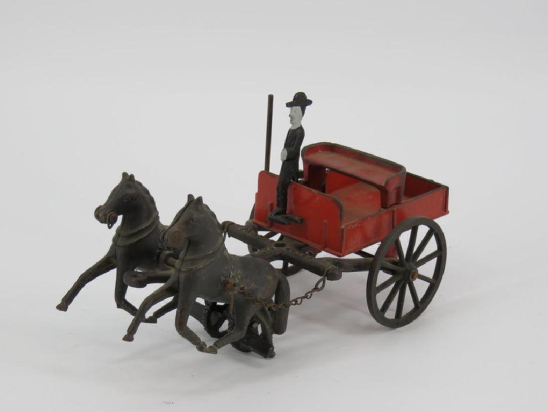 SoldLARGE WILKINS CAST IRON 2 HORSE DRAYNice early cast iron Wilkins dray. Paint is all original and there are no cracks or repairs. The driver is an antique cast iron figure, but is not for this toy. The toy looks like it will clean to a hSee Sold Price