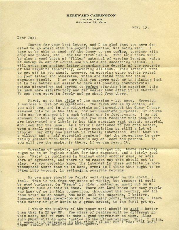 Carrington, Hereward. Typed Letter Signed, “Hereward,”