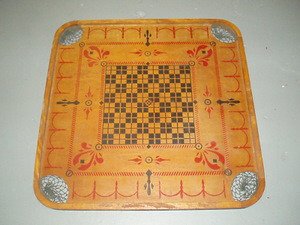 SoldParcheesi GameboardNautical theme parcheesi game board, one sided. Circa 1900. Original paint on wood panel. Earth tones with an orange anchor in each corner. Original condition. 23-1/4" x 23-5-8". Please refer to thisSee Sold Price