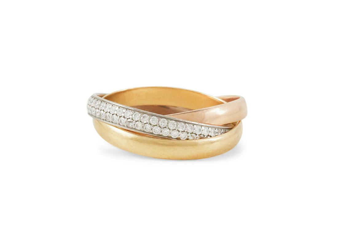 SoldCARTIER 18K Gold and Diamond "Trinity" RingCARTIER 18K Gold and Diamond "Trinity" Ring with an 18k yellow, rose, and white gold band pave-set with single-cut diamonds; signed inside the rose gold band; 3.08 dwts.; size 51 (5 3/4-6)See Sold Price
