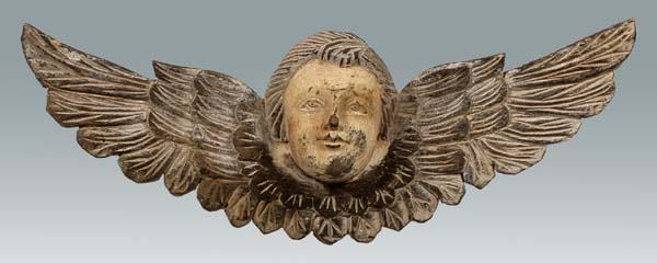 Carved and painted winged cherub,