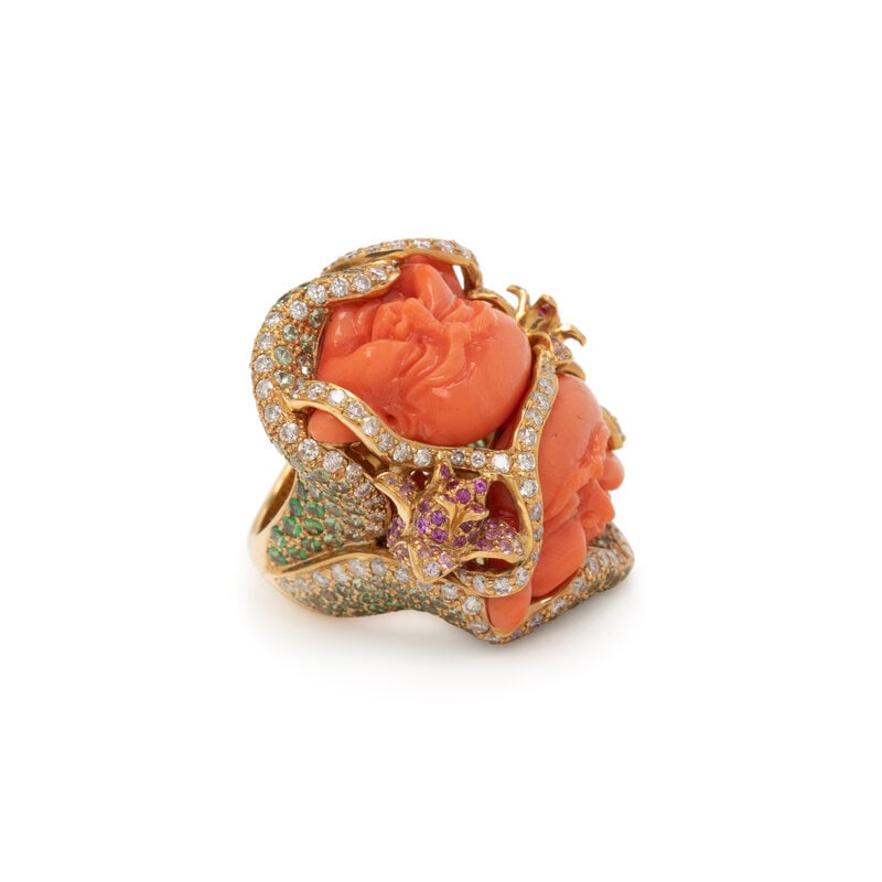 CARVED CORAL AND MULTIGEM RING