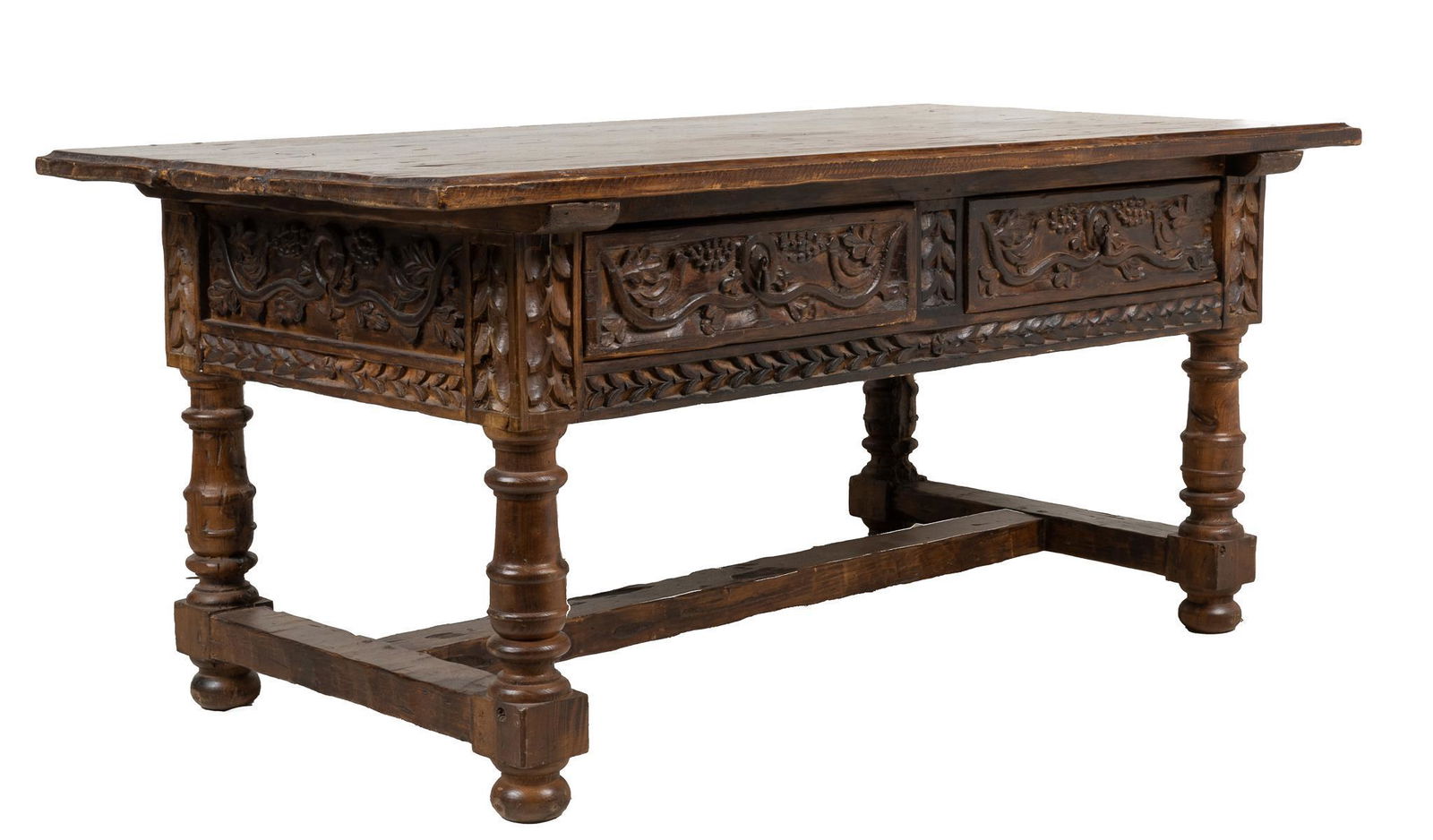 SoldIMPRESSIVE SPANISH BAROQUE CARVED TABLE, 18TH CImpressive Baroque carved library table or desk, Barcelona, 18th c., having a rectangular single board top over foliate carved case, fitted with three deep drawers with bronze pulls, rising on taperedSee Sold Price