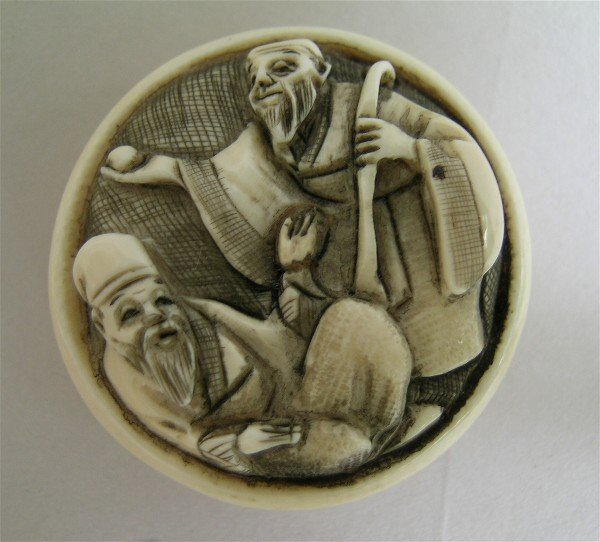 SoldJAPANESE CARVED IVORY MANJU NETSUKE BY KOGETSUSAI NAOMASA First Half of the 19th Century DiameterJAPANESE CARVED IVORY MANJU NETSUKE BY KOGETSUSAI NAOMASAFirst Half of the 19th CenturyOniwakamaru slaying the Giant Carp. Carp with double inlaid eyes. Back with carved waves. Signed and seal markedSee Sold Price