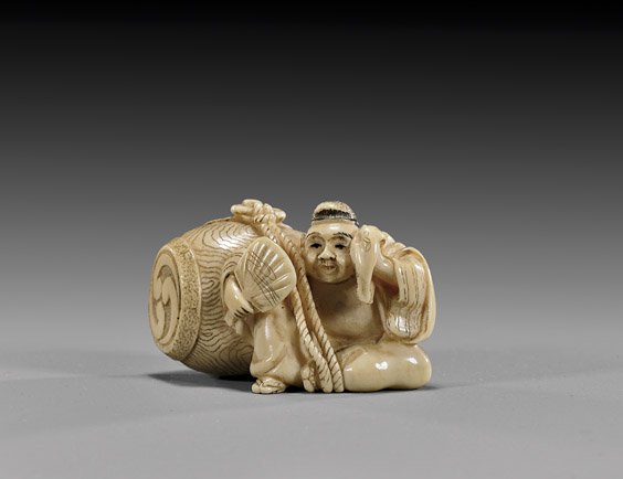 CARVED IVORY NETSUKE: Deity & Barrel