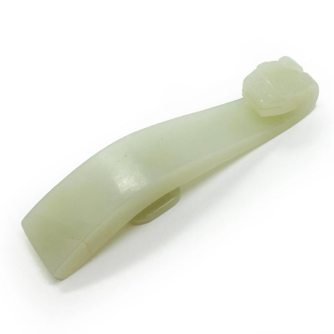 Sold(2) Chinese Carved Jade Belt Hooks.Includes a Chinese carved jade dragon belt hook; and a second elongated Chinese carved jade belt hook with scroll finial. Total approx. weight of the dragon belt hook is 30.8 grams (gross); total apprSee Sold Price