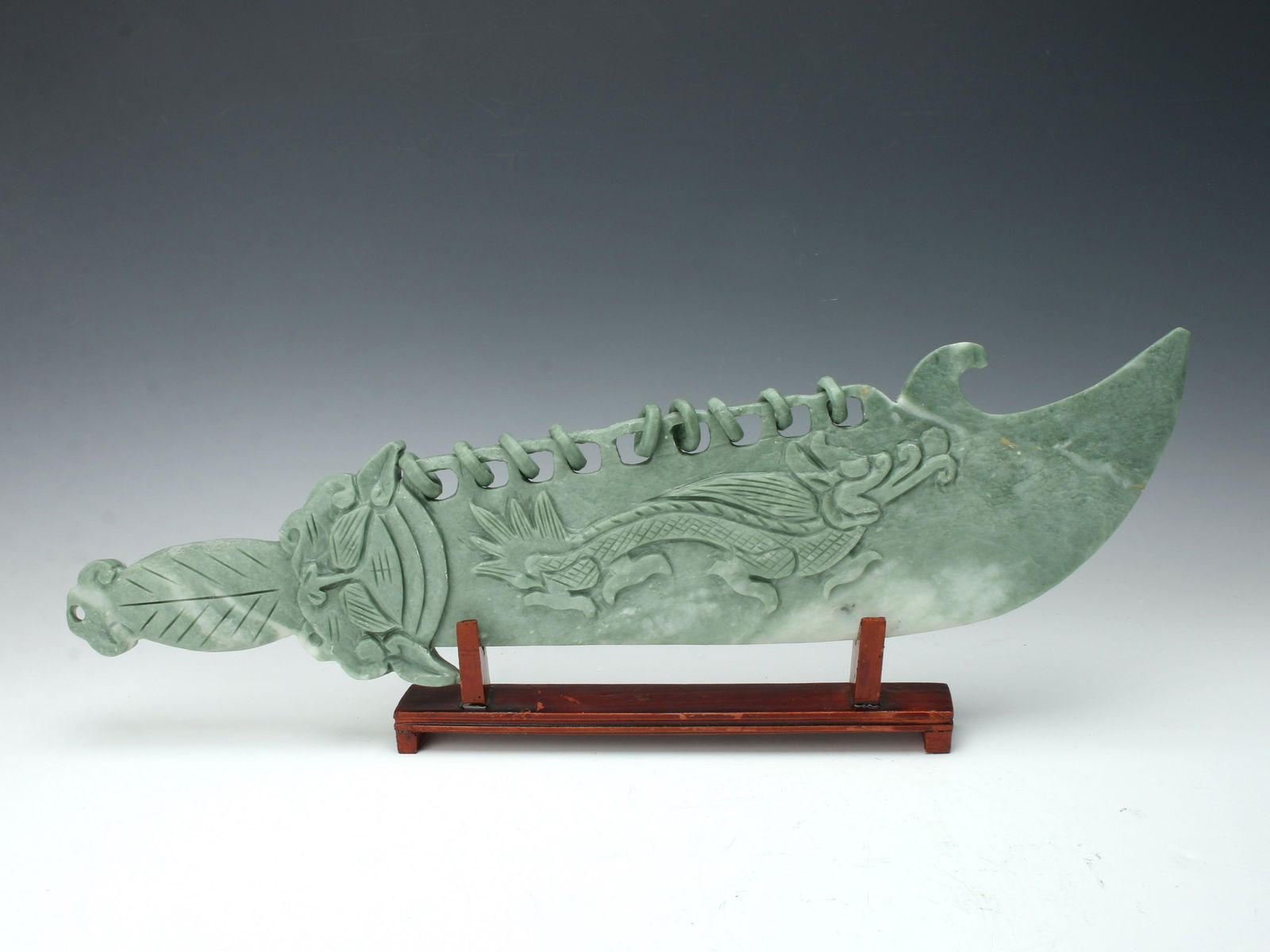 CARVED JADE DECORATIVE BLADE ON STAND