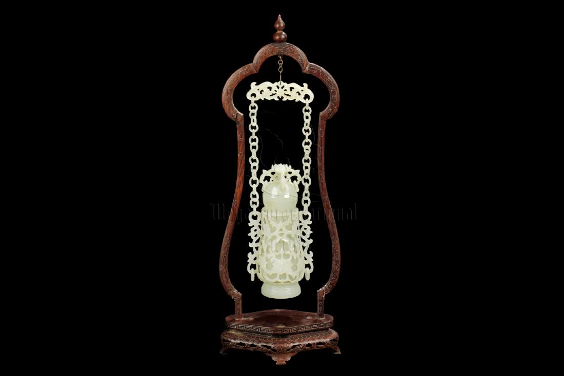 CARVED JADE HANGING VASE WITH STAND