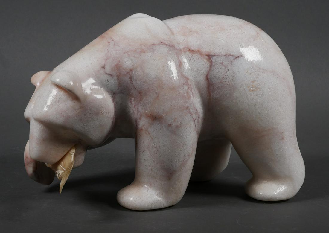 Carved Marble Bear with Fish Sculpture