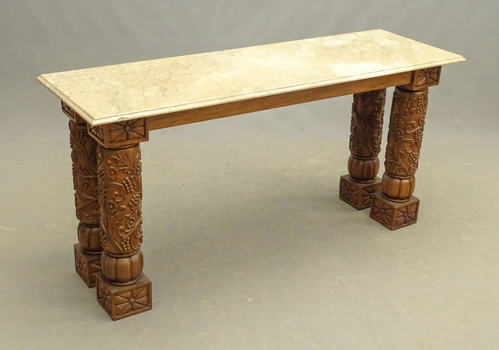 SoldRENAISSANCE REVIVAL FIGURAL CARVED MARBLETOP TABLECarved walnut. Classical forms. With an inset marble top. Dimensions: H 28" x W 32" x D 20.75". Condition: Slightly wobbly. Rubbing to edges of table top.See Sold Price
