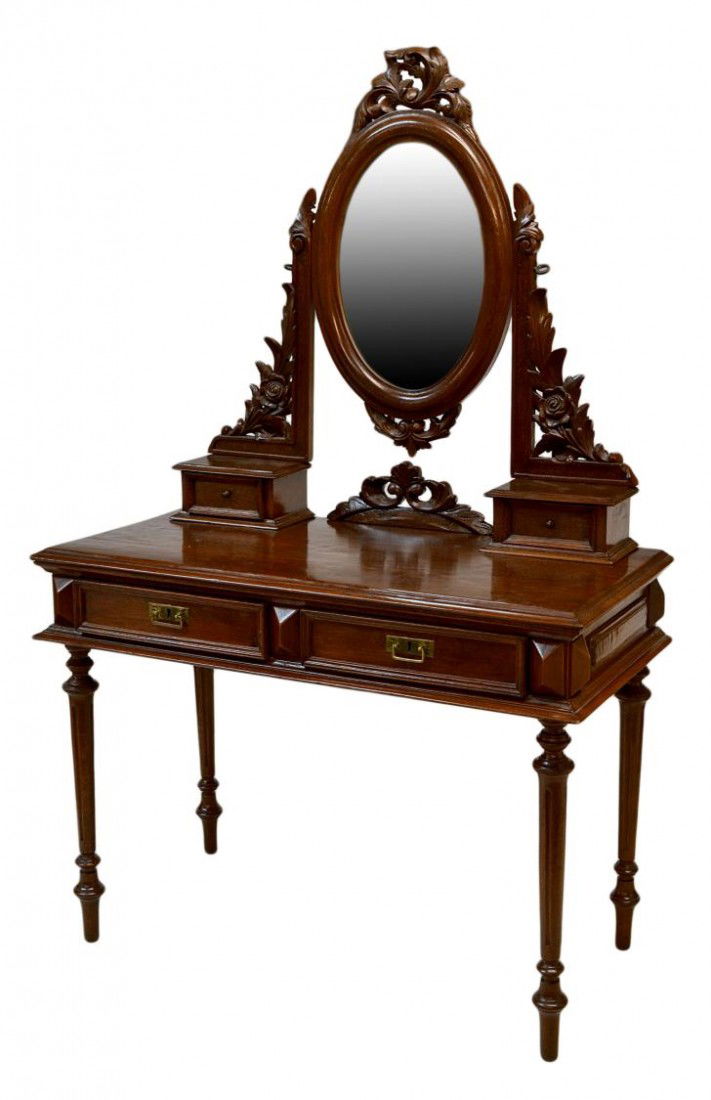 SoldVENETIAN CARVED WALNUT MIRRORED VANITY TABLEVenetian carved walnut vanity/ dressing table, first half 20th c., case with parquetry accents, fitted with four drawers, framed beveled mirror having openwork foliate carved crest and rocaille supporSee Sold Price