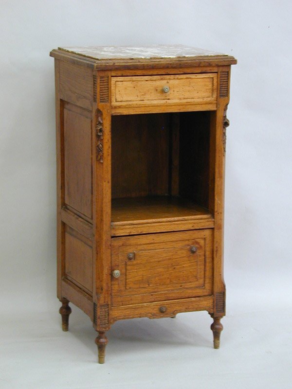 SoldFine condition 7 pc matching carved oak bedroom setFine condition 7 pc matching carved oak bedroom set featuring armoire w full length oval beveled mirror door, pr of marble top end tables, marble top dresser w oval beveled mirror, double bed & pr ofSee Sold Price
