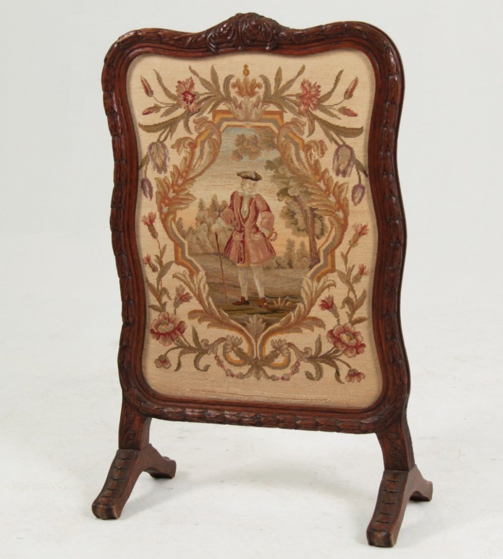 CARVED OAK FRENCH NEEDLEPOINT FIRE SCREEN