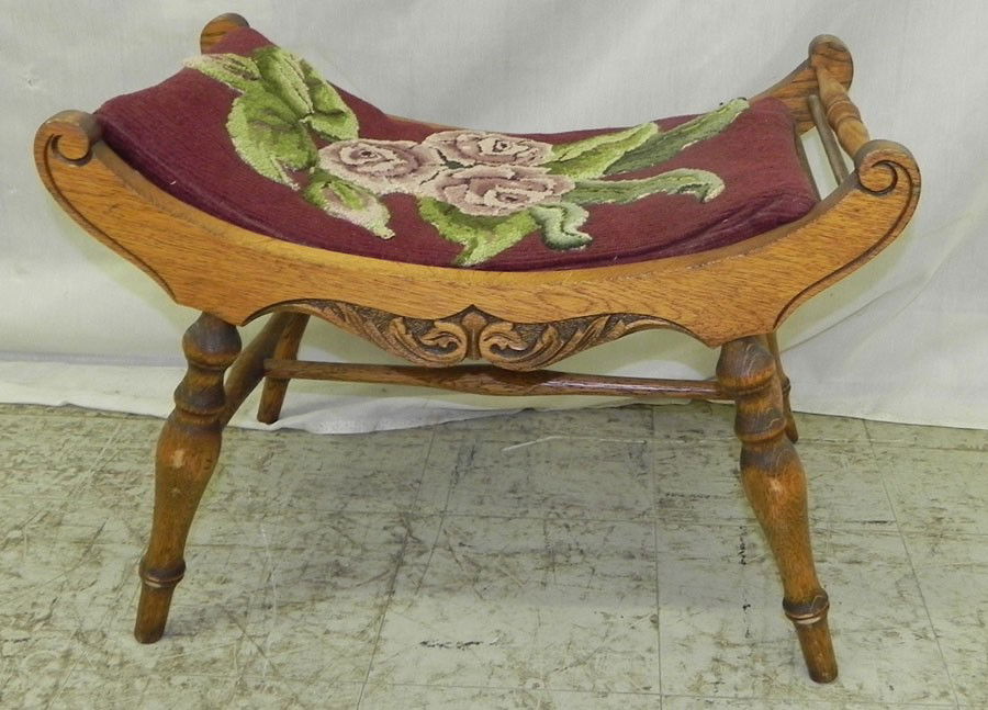 Carved oak needlepoint vanity bench. 24" wide.