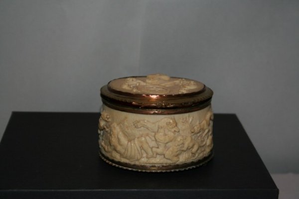 CARVED OVAL BONEBOX W/BRASS SURROUND SHOWING BEAR