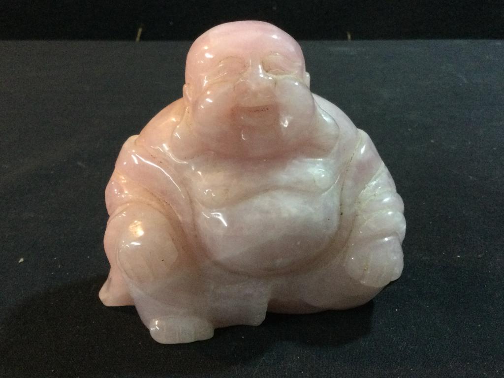 SoldLARGE CARVED ROSE QUARTZ HAPPY BUDDHASeated on a large lotus plant, holding a lotus in his right hand. On a wooden stand. H: 13 1/8 in.See Sold Price