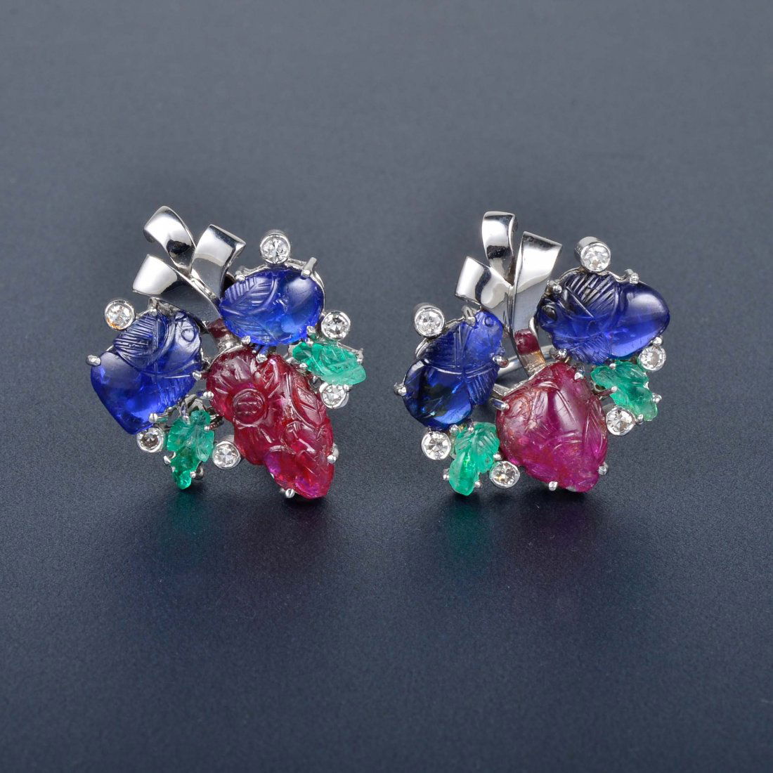 Carved Sapphire, Ruby, Emerald Platinum Earrings