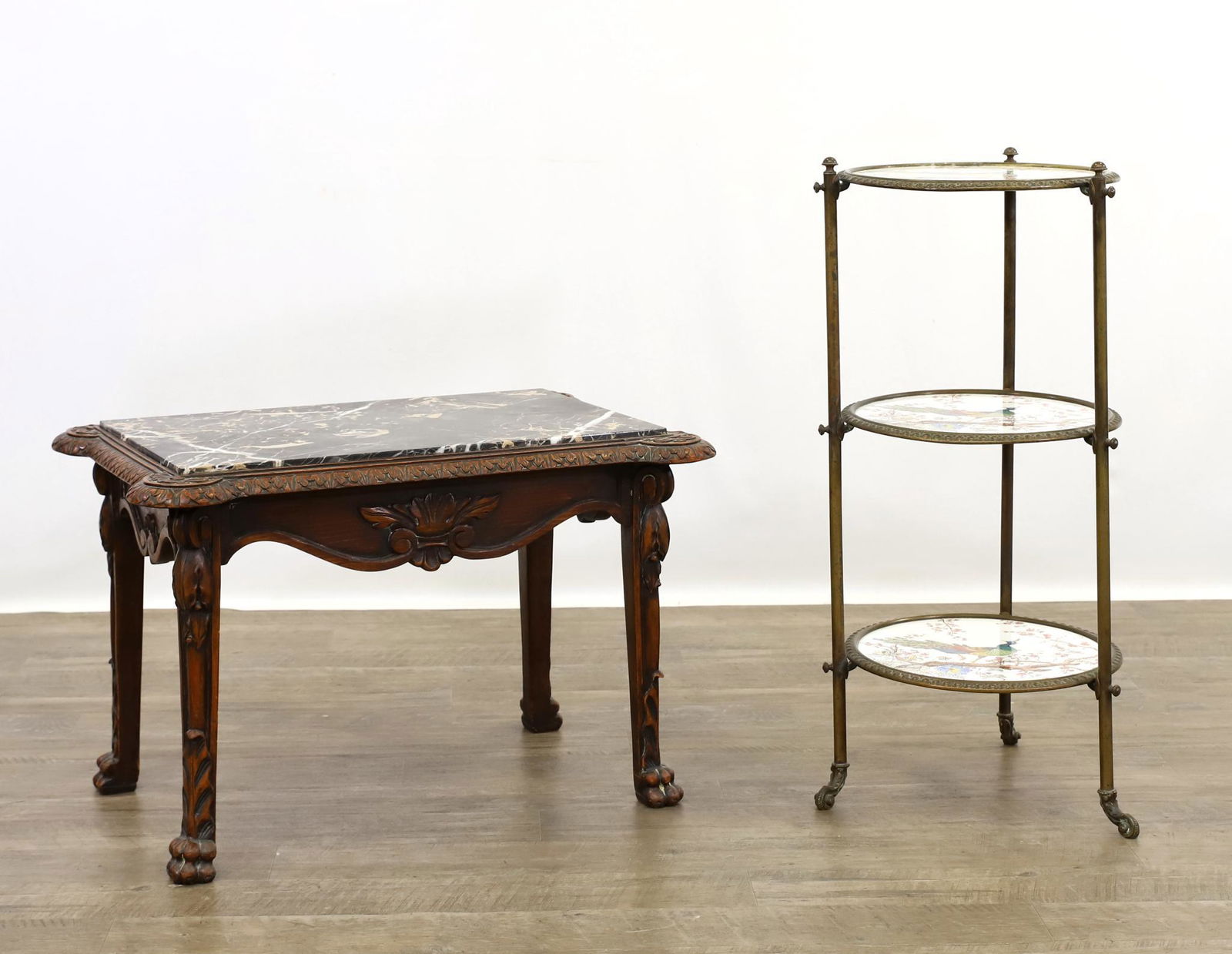 Carved Walnut Side Table and Brass Tiered Stand