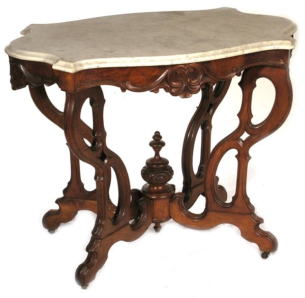 CARVED WALNUT VICTORIAN TURTLE MARBLE TOP TABLE