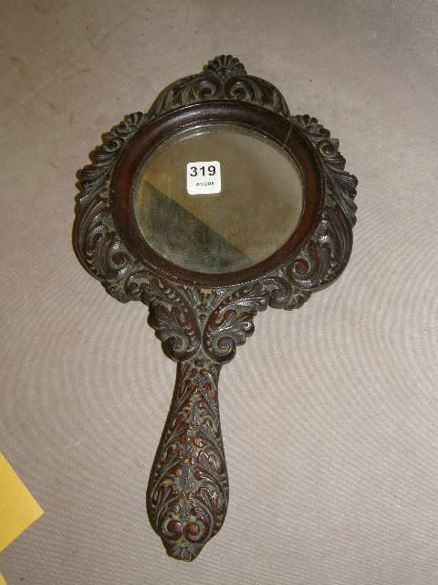 Antique carved wood handheld mirror