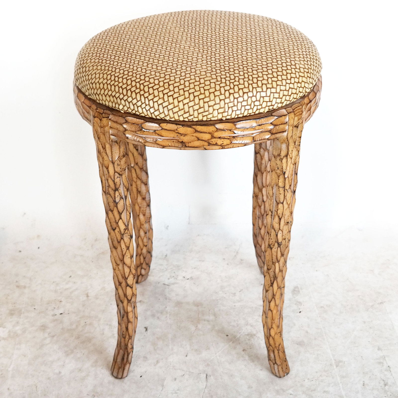SoldBaroque-Style Carved Wood Stool20th century; the tufted green leather seat on four mask-headed cabriole legs with paw feet 19 x 22 x 16 in. (48.3 x 55.9 x 40.6 cm.) Provenance: The Walter and Donna Conn Estate; located within the dSee Sold Price