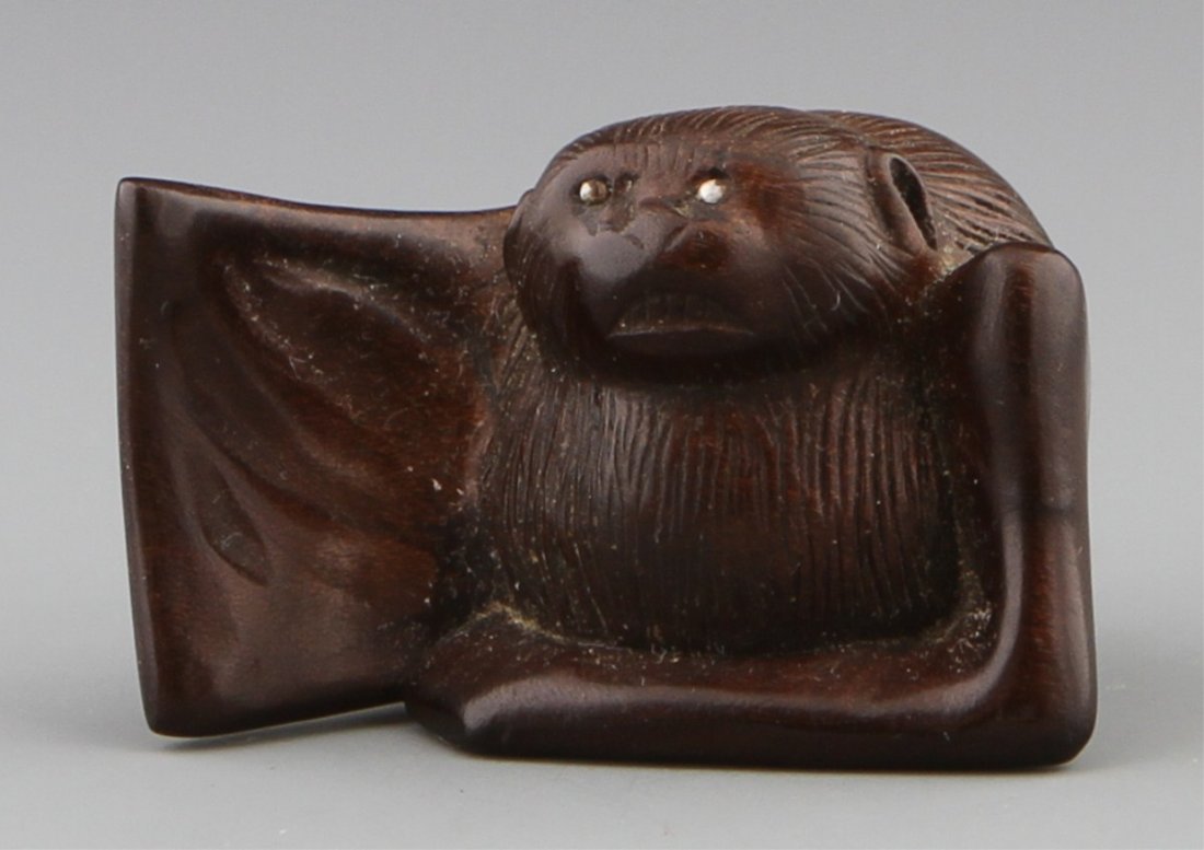 CARVED WOODEN NETSUKE BAT SIGNED