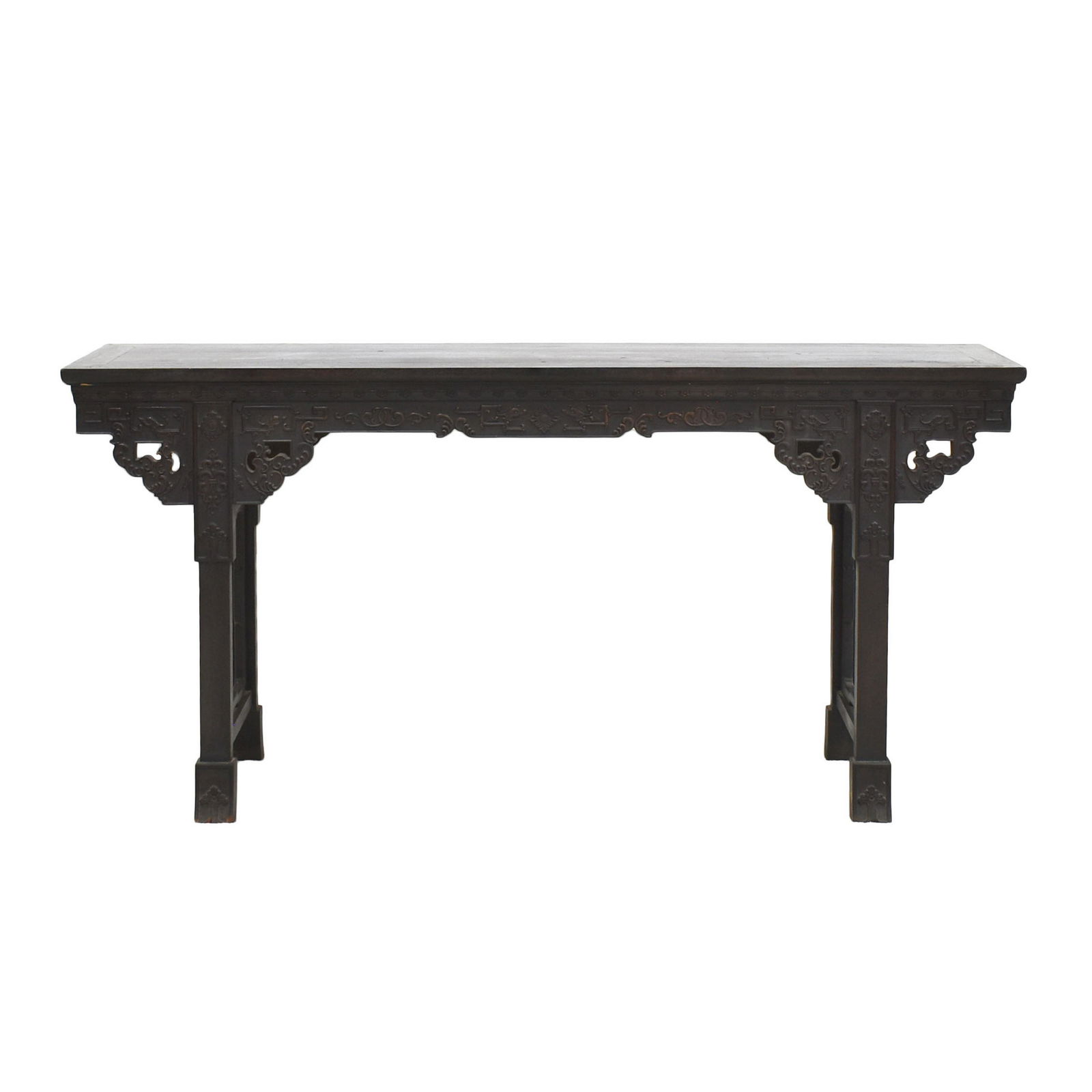 SoldANTIQUE CHINESE ZITAN EVERTED RIM LONG ALTAR TABLEDimensions: 33" H x 98" L x 22" D Antique Chinese carved zitan long altar table. The rectangular top with a framed center slab of Huanghuali. A carved band runs the perimeter of the table just below tSee Sold Price