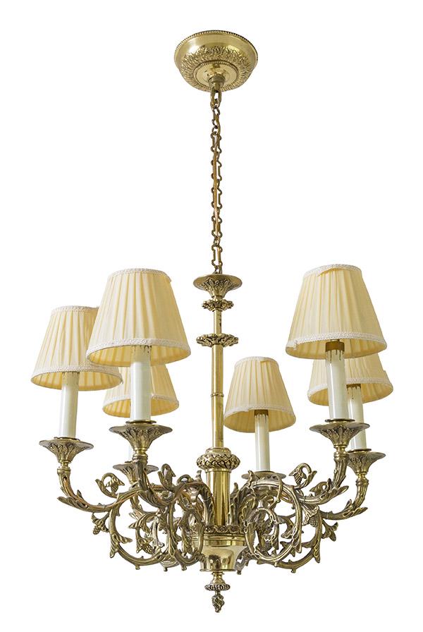 SoldClassic early 20th C Petite Electrified Cast Brass ChandelierClassic early 20th C Petite Electrified Cast Brass Chandelier fitted with 6 candlesticks and small flame shaped lightbulbs. All set into a lobed frame decorated as a lacy gallery and braced by floralSee Sold Price