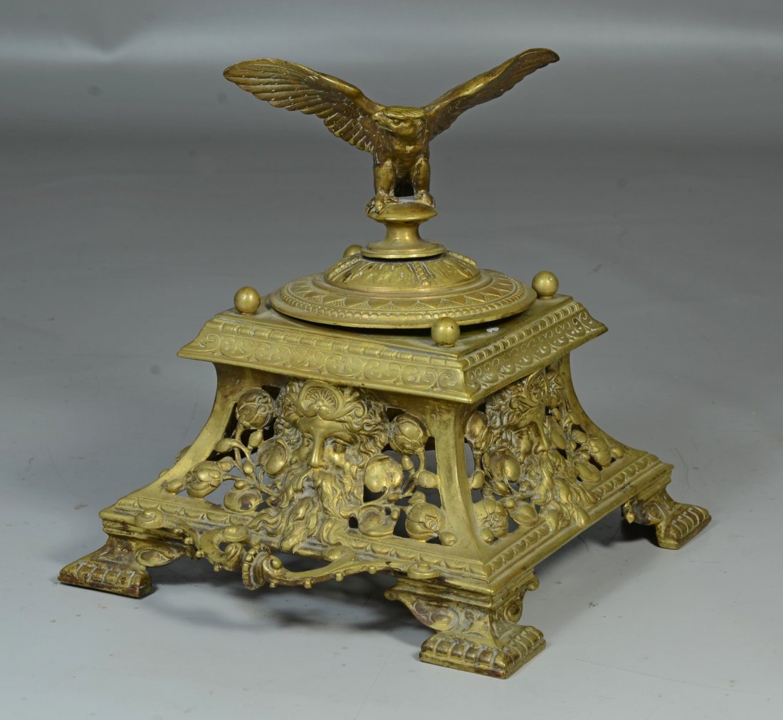 Cast brass Victorian inkwell, eagle hinged lid, lacking