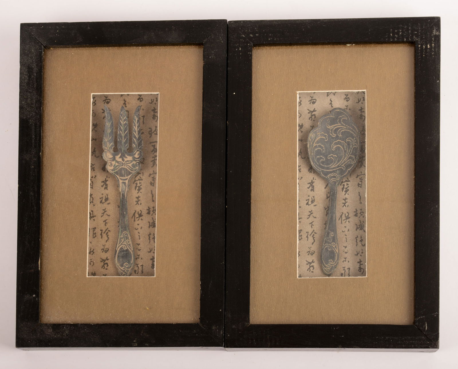 Cast Bronze Fork and Spoon in Shadow Box Frames.