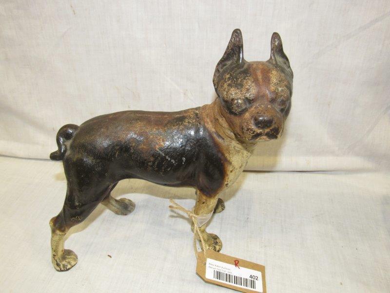 SoldOld Cast Iron Boston Terrier Bulldog Dog Door StopVintage cast iron Boston Terrier, boxer dog door stop. Dog: 10 1/2 in. x 10 in. x 5 in. Good to fair condition, showing normal age wear, paint loss and some rust oxidation. Auction Gallery in house coSee Sold Price
