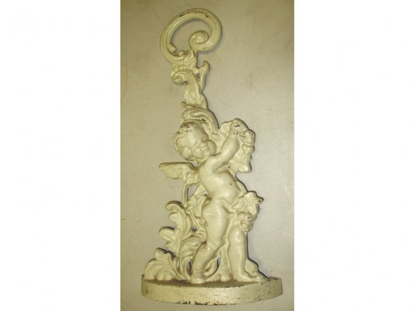 SoldVintage Gilt Cast Iron Cherub Doorstop 17inVintage gilt cast iron doorstop. Cherub with grapes and scroll design. Piece is heavy. Measures approx 8.5 x 2.5 x 17.5 inches. Some loss to gilt. Doorstop, vintage doorstop, cherub doorstop, gilt dooSee Sold Price