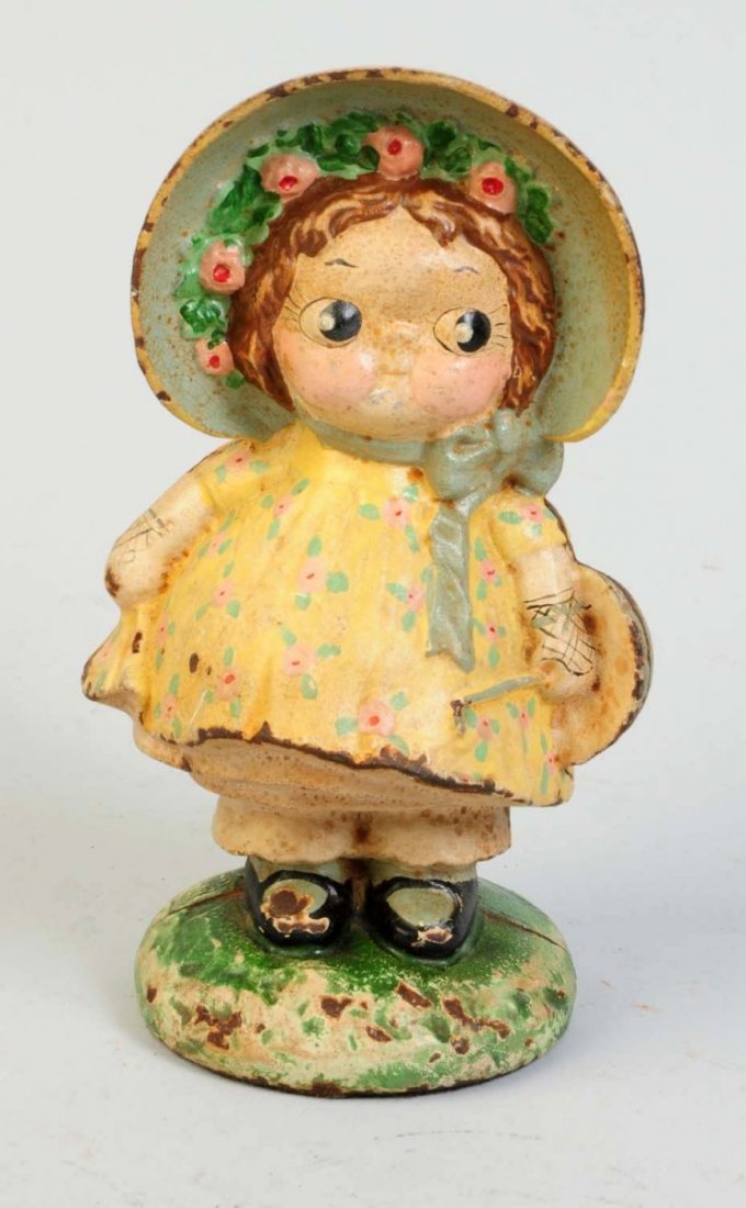 SoldSUNBONNET SUE (DOLLY DIMPLE), PAINTED CAST IRONSUNBONNET SUE (DOLLY DIMPLE), PAINTED CAST IRON BANK/DOORSTOP. HEIGHT 7 1/2"See Sold Price