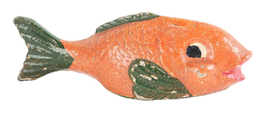 SoldAntique Fish w/ Glass Eyes Cast Iron DoorstopItem: Antique Fish w/ Glass Eyes Cast Iron Doorstop Date/Period: Circa 1930's. Dimensions: 4 1/2" Height x 5 1/2" Width x 3 1/2" Depth. Antique Cast Iron Fish Doorstop with original glass eyes. UnusuaSee Sold Price