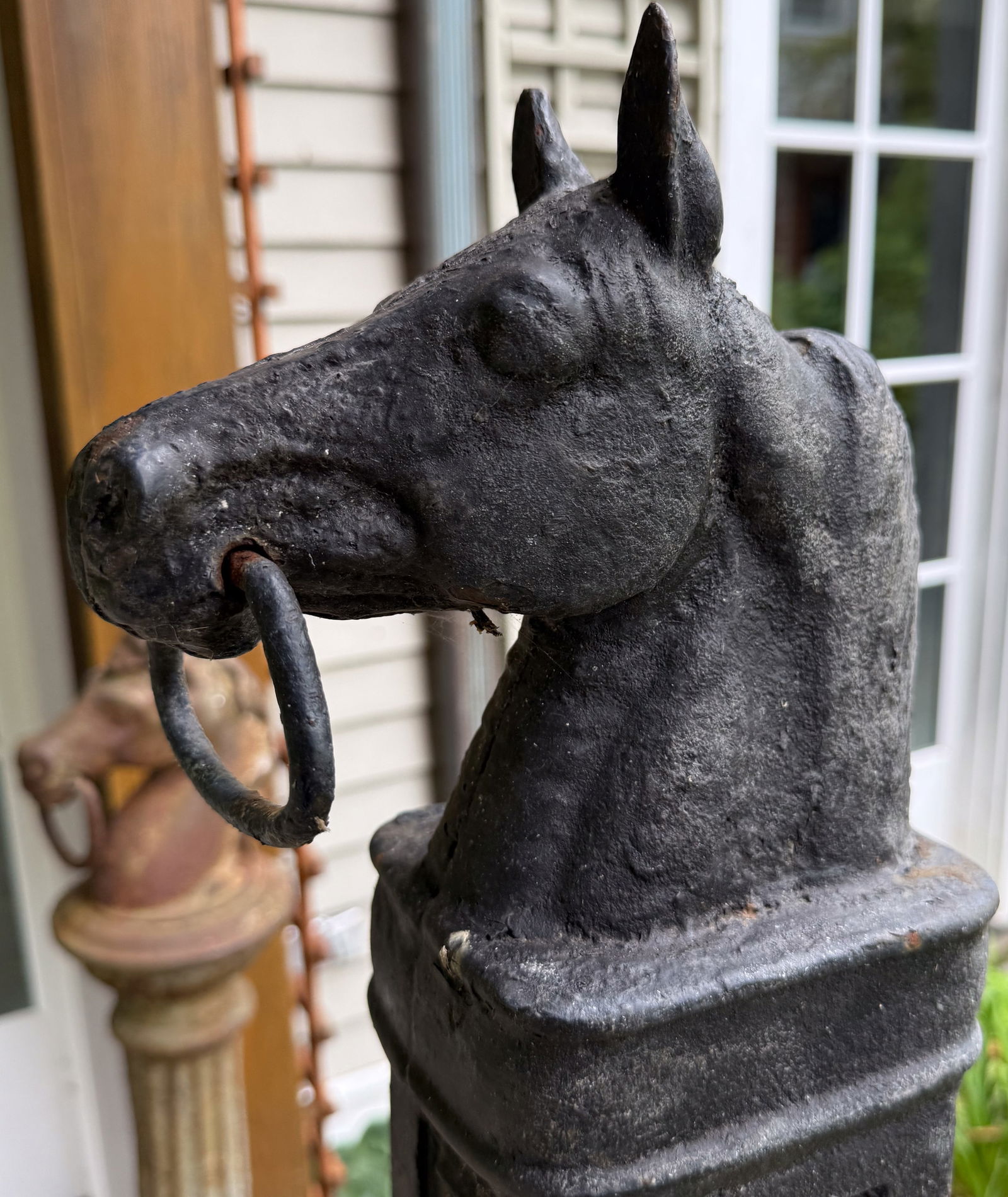 SoldAntique Black Painted Cast iron Horse Hitching PostAntique Black Painted Metal Horse Hitch Post w/ Ring. Simple horse head hitch post with a metal mouth ring to tie your rope to. Can be used to hitch your horse, dog, or anything valuable to. DimensionSee Sold Price