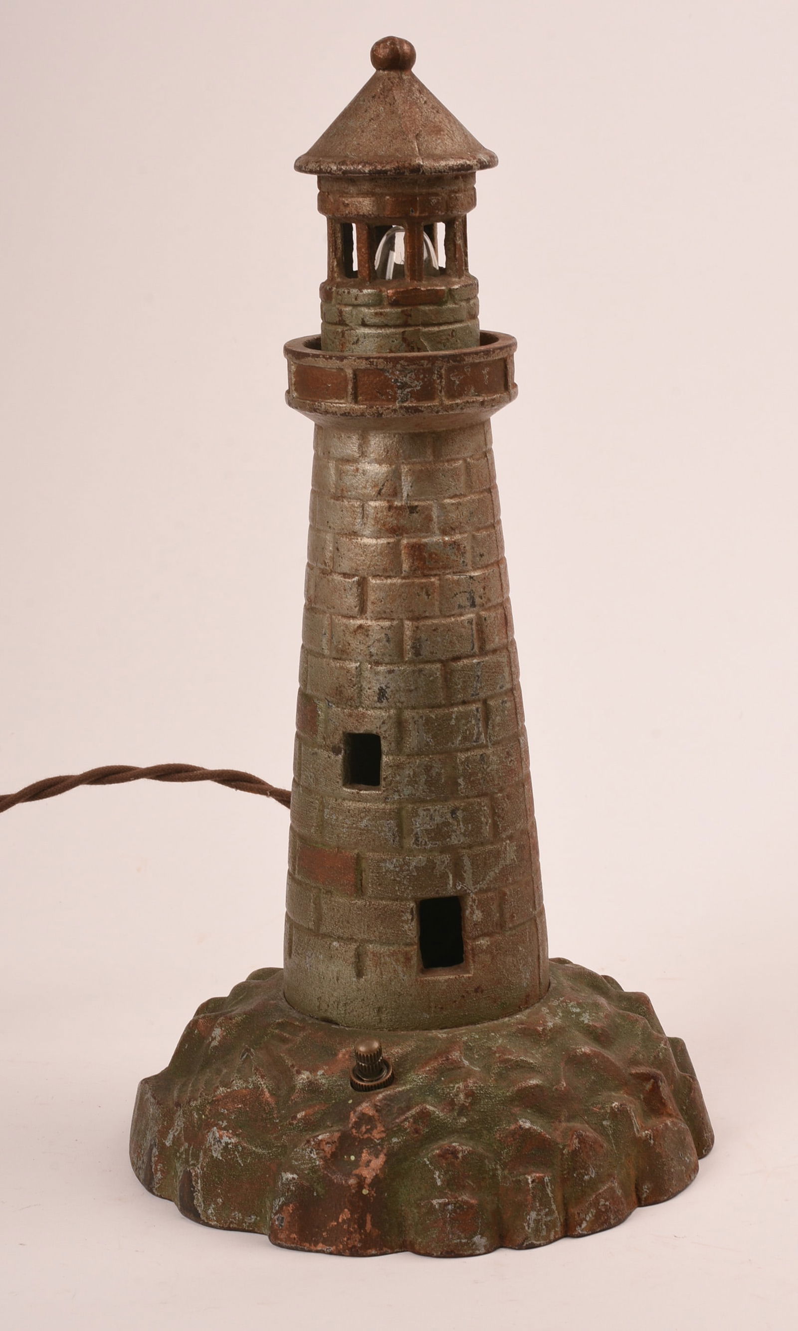 SoldAntique Cast Iron Lighthouse Lamp Late 19th CenturyCast Iron Lighthouse Lamp. Late 19th C, American. Well detailed 3 dimensional castings, depicting tapered stone lighthouse on rocky outcrop base. The lamp in working order. Fine dark, lightly oxidizedSee Sold Price