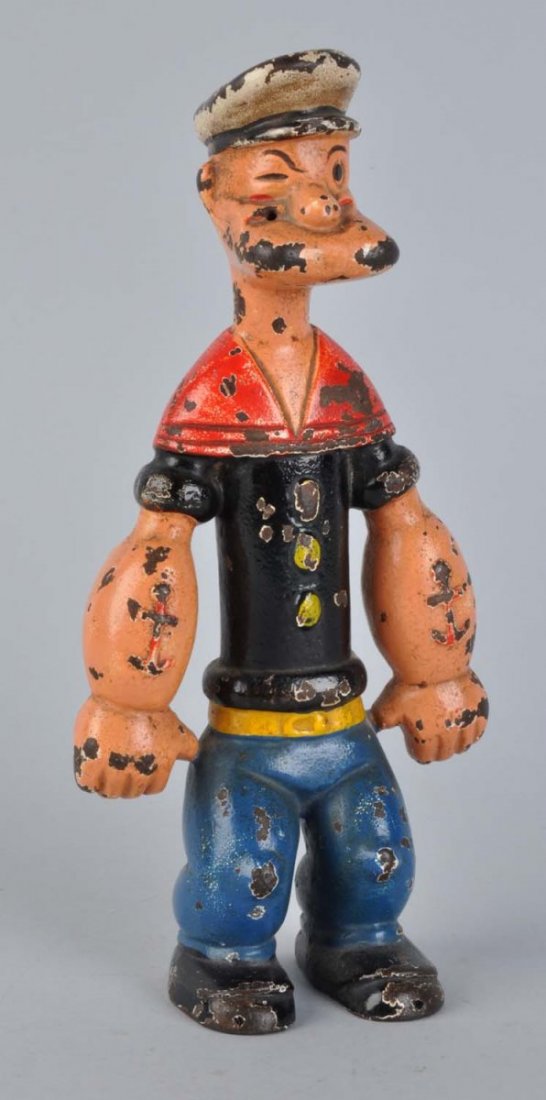 SoldCAST IRON HUBLEY POPEYE DOORSTOPShows Popeye in standing position with beautiful red, black, blue and yellow paint. Marked "1929 King Features Syn." on back. CONDITION: Original pipe, which is very difficult to find complete. Some oSee Sold Price