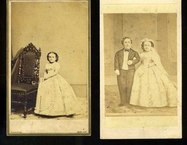 SoldCDV PHOTOGRAPHS OF GENERAL TOM THUMB AND WIFEMr. & Mrs. General Tom Thumb in Wedding Dress, a Brady photograph copyright 1863, has printed signatures of Stratton (Tom Thumb) and his wife on the reverse. Another of General Tom Thumb and Wife, comSee Sold Price