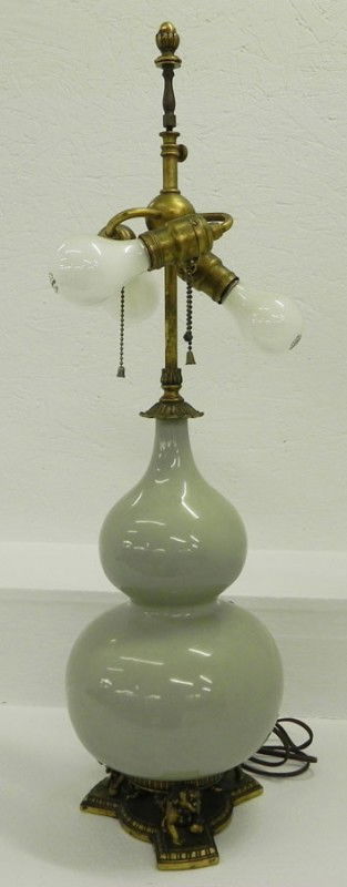 Celadon Chinese lamp w/ Brass Foo dog base.