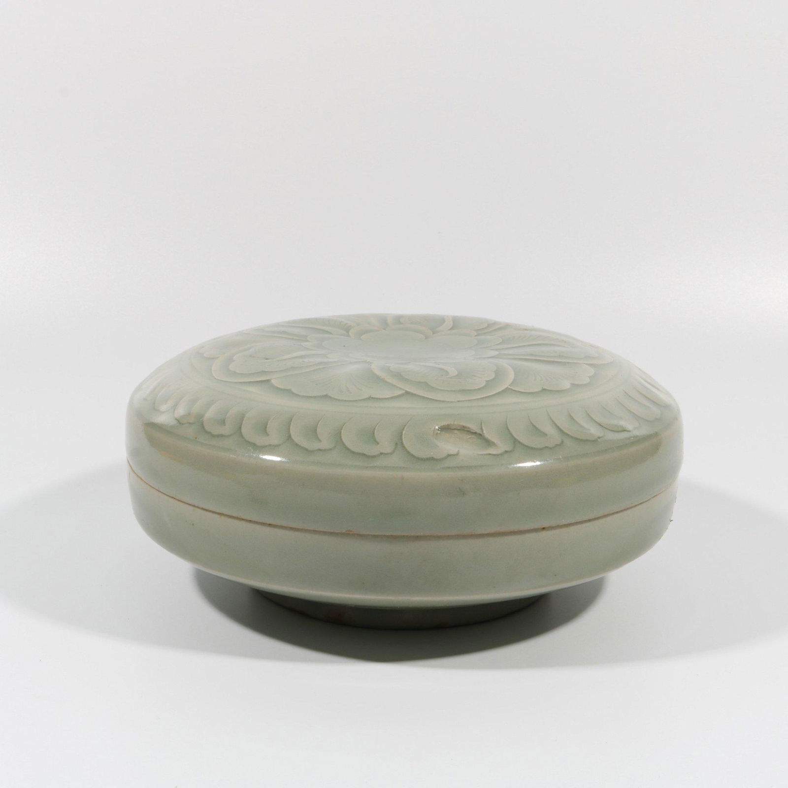 SoldHUTIAN WARE CELADON BOX WITH LID, SOUTHERN SONGHUTIAN WARE CELADON BOX WITH LID, SOUTHERN SONG DYNASTY, CHINA H. 9 cm. Diam. 7 cm.See Sold Price