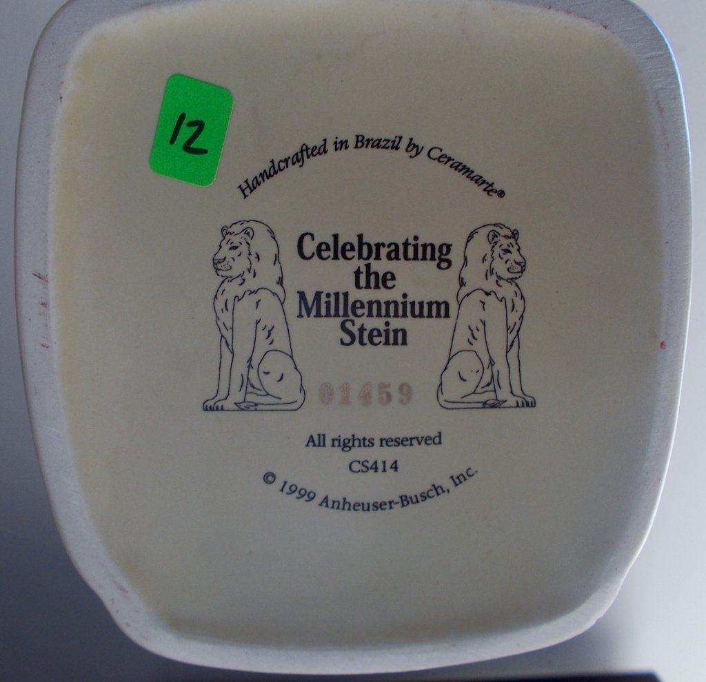 SoldCeramarte Budwieser CS414, Brazilian Beer Stein, Celebrating the Millennium8 1/4" Tall pottery in relief with gold trimmed pewter lid with 30% lead crystal finial, Ltd. Ed. Of 10,000 produced, circa 1999See Sold Price
