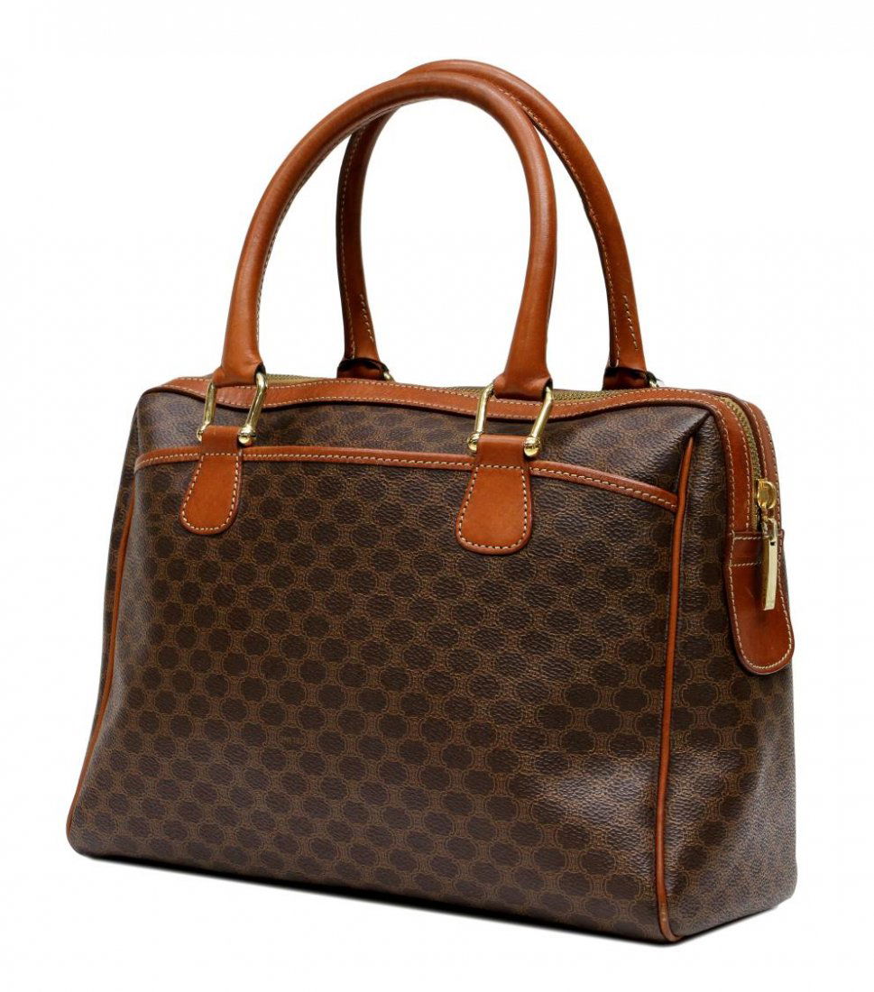 SoldVINTAGE CELINE MACADAM MONOGRAM CANVAS HANDBAGVintage Celine handbag in brown macadam monogram canvas, brown leather accents and piping, dual brown leather handles, gold tone hardware, flat exterior pockets on either side, single zipper closure,See Sold Price
