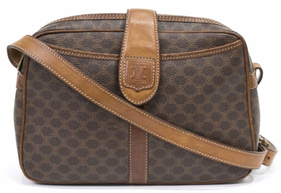 SoldVINTAGE CELINE MACADAM CANVAS CROSSBODY BAGVintage Celine crossbody shoulder bag, in brown Macadam coated canvas, light brown leather shoulder strap, gold-toned hardware, outer pocket with snap closure, zip closure at top, inner zip pocket, liSee Sold Price