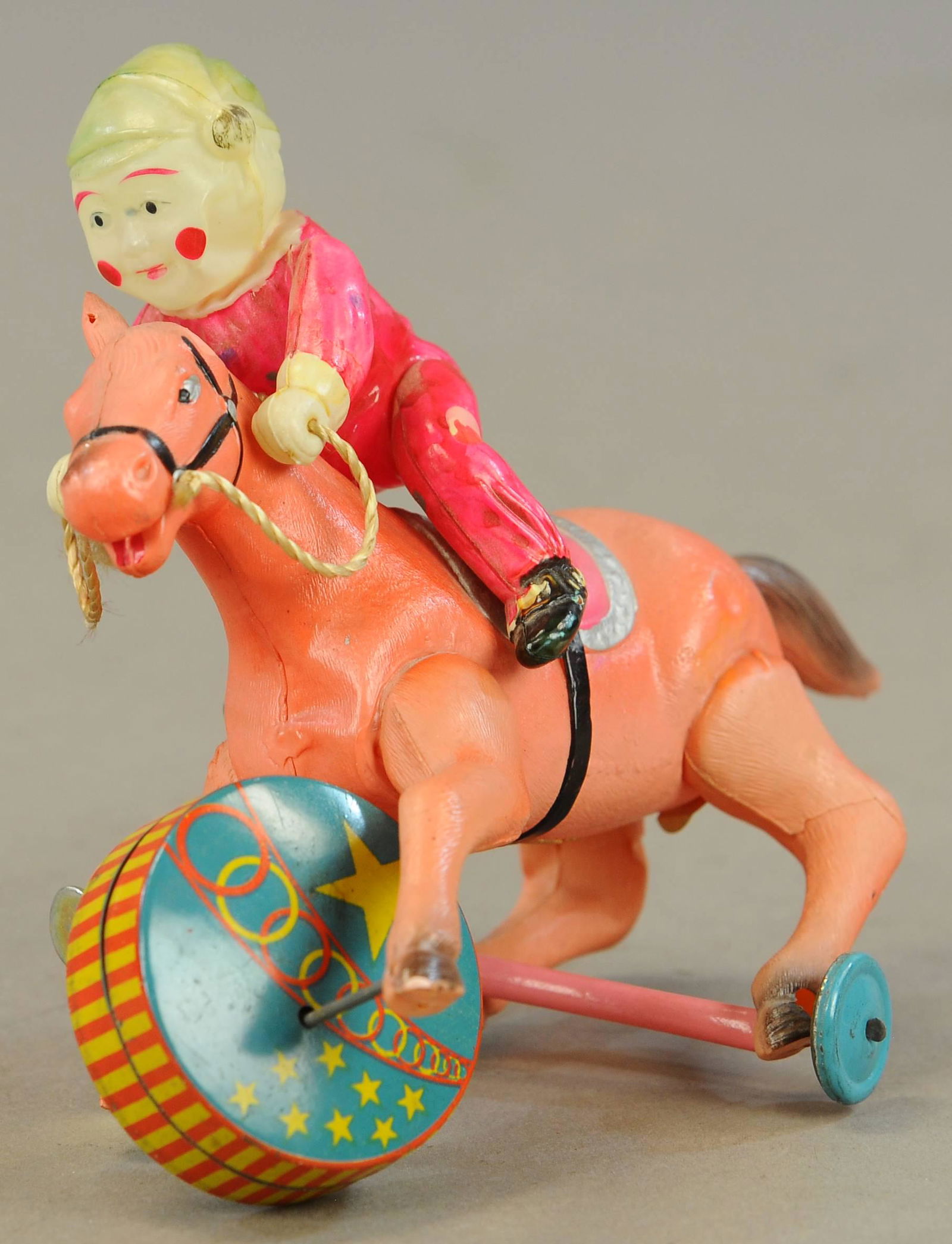 CELLULOID CLOWN RIDING HORSE